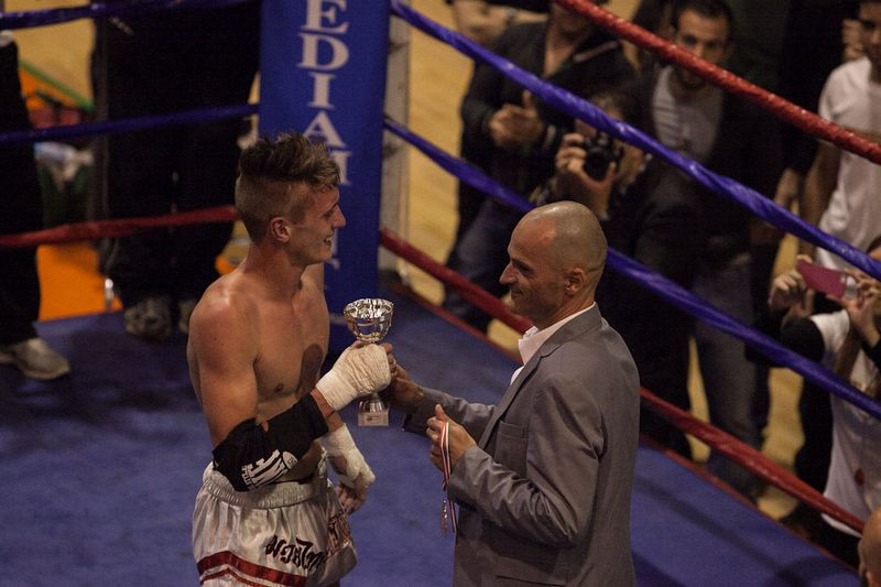 La prima disciplina salita sul ring è stata la boxe con nove incontri. Il primo, combattuto dal biellese kunze, della società Biella Boxe, contro Andrea Sanca della Boxe Lumezzane, ha visto l’ ospite prevalere sul padrone di casa in tre round da due minuti ciascuno nella categoria junior. Il secondo incontro invece ha visto Marzia Rizzo della Skull boxe di Asti perdere ai punteggi contro Majorie Bausone della kick boxing Vercelli. Nel terzo incontro è salito di nuovo sul ring un giovane biellese,Emil Mingardo della Biella Boxe, che nonostante la sua velocità è riuscito ad ottenere solo un pareggio nella sfida con Alberto Cuda, della Boxe Verbania. Nel quarto incontro un’ altra dura sconfitta per i biellesi, ma non per demerito, infatti Stefano Campi ha dovuto vedersela con Damiano Iaconis della Boxe Lumezzane, che ha dimostrato la sua superiorità in uno scontro tra giganti (91 kg). Il quinto incontro ha visto sfidarsi Giampiero Bono della Biella Boxe e Edoardo Pasqualini, della Skull Boxe Asti. Il secondo round è stato uno dei più accesi, il biellese in uno scambio ha risposto con una scarica di diretti ad un gancio al volto molto potente, entusiasmando il pubblico. Da qui in poi il combattimento ha visto molte interruzioni arbitrali per scorrettezze, fino alla sospensione per KO tecnico a un minuto dalla fine per emorragia dall’ arcata sopraccigliare ai danni di Giampiero Bono. Nel sesto incontro il bravissimo Ivan Zucco della Boxe Verbania ha dominato contro Klodian Xhetani della Boxe Cuneo, senza dargli tregua e combattendo una gara da applausi per intelligenza, tecnica e bravura nel dominare il match. Il settimo incontro è stato vinto dall’ allievo della Boxe Cuneo Iosif Robert Blaj, che ha combattuto contro Boris Kolcev della Boxe Fitness Barge.