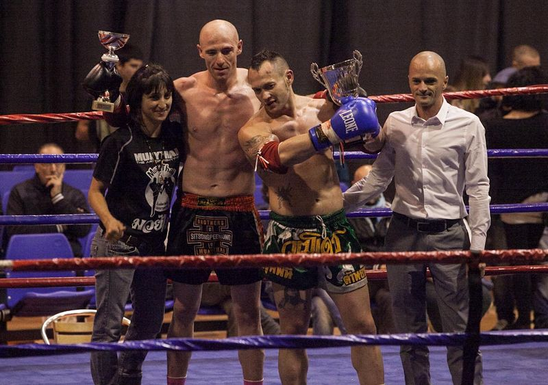 È a quel punto che è iniziato l’incontro più atteso, il march della giornata, Matteo Pippi contro Gianluca Crepaldi in uno scontro Pro di Muay Thai. La sfida ha alternato momenti statici dove i due lottatori si sono chiusi con clinch resistenti come una morsa, combattendo solo con ginocchia e gomiti a distanza ravvicinata ad altri dinamici, dove lo sfidante di Novara ha lasciato partire diversi calci circolari diretti al volto accusati dal padrone di casa. Nel secondo round l’arbitro ha interrotto per la perdita di sangue dall’ arcata sopraccigliare subita da Pippi, ma l’incontro è continuato. i due si sono scambiati colpi violenti e quando sono arrivati al terzo round sembravano entrambi stremati dalla stanchezza; sul finale Crepaldi perdeva sangue dal naso per un colpo subito. Verdetto finale parità.