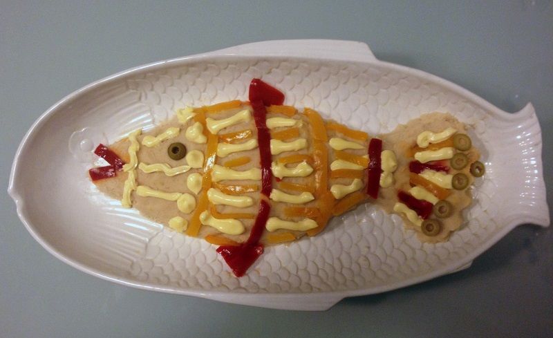 Il Pesce finto (o Pesce morto...) è davvero un ottimo antipasto, di solito molto gradito anche ai bambini. Vi servono, per il pesce: 1 chilogrammo di patate (meglio a pasta gialla, dato che le dovete schiacciare), 50 gr di burro, il succo di mezzo limone, due scatolette di tonno sott’olio, 4 cucchiai di maionese, sale e pepe q.b. Come si procede: pelate le patate, lavatele, tagliatele in pezzi, grossolanamente, e fatele lessare in abbondante acqua salata fino a quando non saranno morbide (tastatele con la forchetta, scolatele quando affonda con facilità). Trasferitele in una terrina abbastanza grande, in cui avrete già collocato il burro tagliato a tocchetti, e schiacciatele con uno schiacciapatate di quelli con il manico (in questo modo, amalgamerete contemporaneamente gli ingredienti). Aggiungete quattro cucchiai di maionese, il succo di mezzo limone, assaggiate e aggiustate di sale e di pepe. Dovrete ottenere un mousse cremosa, ma non molle. A questo punto cercate una barchetta piuttosto grande e modellate il pesce, cercando di ottenere uno strato omogeneo di mousse. Lasciate raffreddare in frigorifero. Ora non resta che decorarlo, ma prima vi propongo una ricetta per la maionese (potete farla in casa o utilizzare quella in tubetto, quella casalinga è sicuramente più buona!): ci vogliono due tuorli, 250 ml di olio di semi di girasole (per i miei gusti con l’olio extravergine risulta troppo forte, per questo piatto serve un sapore delicato), un cucchiaino di aceto, il succo di mezzo limone, sale e pepe q.b. Tutti gli ingredienti devono essere a temperatura ambiente. Mettete i tuorli in una terrina (in questo caso utilizzerete uno sbattitore e frusta) o nel robot da cucina (usate le fruste) e batteteli con l’aceto, il sale e il pepe. A questo punto iniziate ad incorporare l’olio goccia a goccia, fino ad ottenere una salsa piuttosto densa. Quando avrà la consistenza voluta aggiungete il succo del limone, aggiustate di sale, poi copritela con la pellicola e lasciatela riposare in frigorifero. Torniamo al pesce: per decoralo potete usare sottaceti di vario genere (peperoni, cetriolini, carciofini, capperi, olive) l’importante è essere creativi. Nel pesce che vedete nella fotografia, per esempio, ho utilizzato peperoni e olive. Ah! Dimenticavo! Se la maionese è fatta in casa non spargetela con il cucchiaio, ma usate una siringa per dolci. L’impatto estetico sarà migliore!