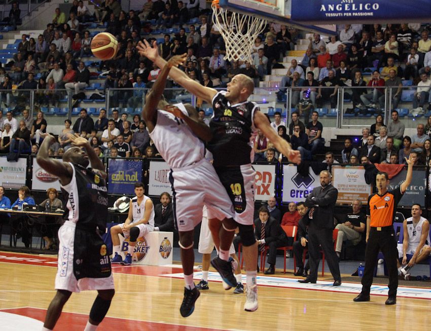 La cronaca del match. 1° quarto. Coach Corbani schiera il tradizionale quintetto con Laganà in regia, Voskuil guardia, Raspino e Hollis ali, Infante a presidiare i tabelloni. A rompere l’equilibrio dopo un paio di tentativi ci pensa Alan Voskuil con una delle sue triple (saranno ben cinque alla fine del primo tempo). I ritmi sono subito elevati e l’Angelico prende il largo con altre due bombe firmate Laganà e Infante (11-4). Il Lugano reagisce e guidato dal pivot ex Olimpia Milano, Travis Watson, entra in partita. La seconda tripla di Voskuil regala a Biella nuovamente il +7 sul 20-13, prima che capitan Raspino e compagni subiscano un mini parziale di 7-0 per il 20-20.A rimettere la freccia ci pensa Matteo Chillo, con la tripla del 23-20.