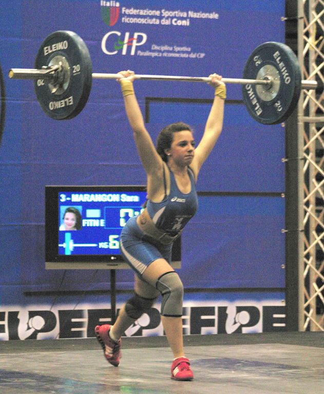 Sara Marangon, classe 1995, è iscritta, invece, nella categoria 48 kg e si presenterà in pedana domenica mattina con il 6° risultato di qualificazione (50 in Strappo e 65 in Slancio): difficile per la talentuosa biellese pensare ad un avvicinamento al podio. Per l'oro non dovrebbe avere rivali l'azzurra Genny Pagliaro (Esercito Italiano, 82+99), olimpica a Pechino 2008, campionessa Europea in carica e vicecampionessa del mondo nel 2011. Per l'argento è favorita, invece, Eva Giganti (Atl. Ercole 77+87), esperta siciliana 8ª all'Olimpiade di Sidney nel 2000. Per la terza medaglia la lotta è aperte tra Giovanna D'Alessandro (Fiamme Azzurre, 63+80), la sorellina d'arte Alessandra Pagliaro (Atletico Ercole, 61+72) e Maria Teresa Ricci (Natural, 54+74). Completano il lotto di atlete qualificate Lucrezia Magistris (Ginn. Pavese, 50+60) e Gloria Guglielmino (Savona, 50+58).