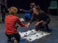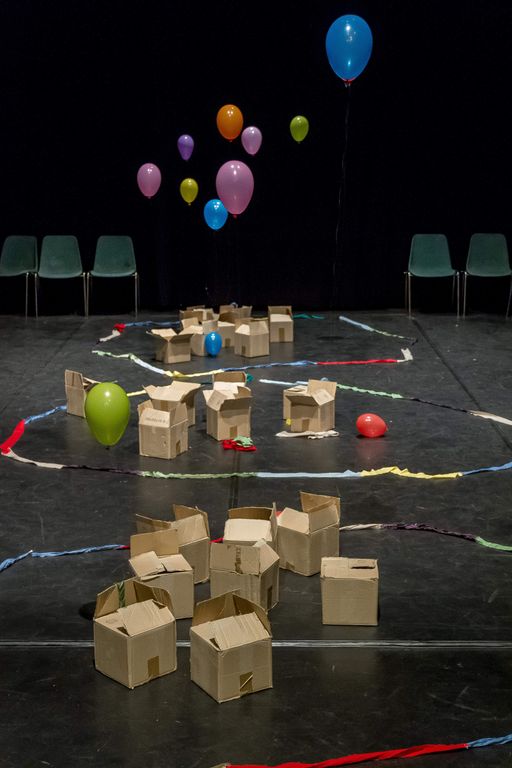 Alla didattica è stata dunque affiancata una fase di ideazione e progettazione, un vero e proprio laboratorio creativo da cui sono nati gli interventi di animazione e le performance presentati durante la serata del 22 gennaio: 9 giochi collettivi che trasformano semplici oggetti e gesti quotidiani in quadri scenici, a cui gli stessi spettatori avranno la possibilità di partecipare. Come “Vocabolario per un ombrello” e “Legami sonori”, creati a partire da un oggetto di uso quotidiano o da materiali di recupero (i nastri di cassette audio); “Cerchiamoci” e “Magic Box”, che scoprono l’aspetto magico delle cose; “Quadri volanti” e “Rotativa”, che creano suggestivi intrecci e interdipendenze fra i movimenti delle persone in scena. E poi ancora “Un altro da me”, che si ispira ai quadri specchianti di Michelangelo Pistoletto, visti dai ragazzi durante una visita a Cittadellarte; e infine “Sasso forbice carta” e “Guardie e ladri”, che rivisitano in modo originale due diffusissimi giochi tradizionali.