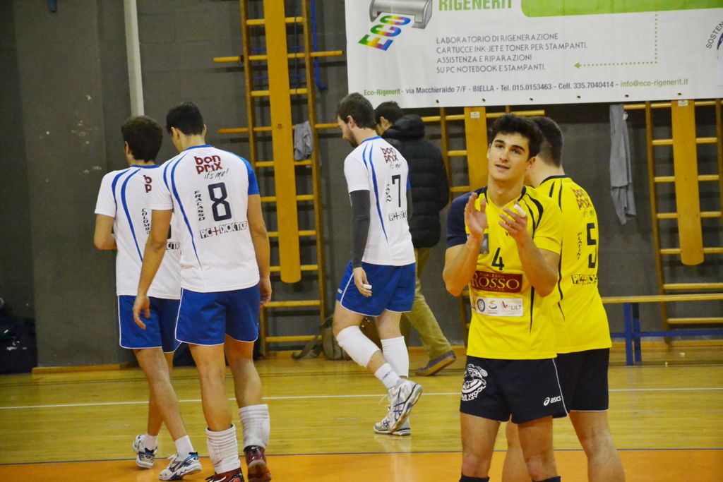 Squadra che vince non si cambia, ma nel secondo set il rendimento cala, vuoi anche per la crescita esponenziale degli avversari che vincono prima a 17 e poi a 21 portandosi avanti 2-1. Finita? Nemmeno per sogno: il quarto set è uno di quelli che rimarranno a lungo nella mente dei protagonisti. Dopo un lungo tiramolla si arriva al 24-25 ospite e al primo di 5 match point consecutivi (alla fine saranno 7) annullata egregiamente dai lanieri. Tanto bravi i ragazzi di Barazzotto nel chiudere positivamente la rigiocata, tanto approssimativi in battuta con 8 errori solo nel finale di questo set in questo fondamentale (alla fine saranno addirittura 30...): la svolta sul 37-37 pari (nuovo record stagionale di punti in un set) quando Biella ottiene il suo ottavo set ball portandosi 38-37 e allo stesso tempo l'ex Fabio Zinetti perde la testa andando ad urlare la sua rabbia direttamente contro i giocatori biellesi e indirettamente contro l'arbitro che di conseguenza estrae il cartellino rosso (il secondo del set dopo quello sanzionato ad un giocatore ospiti sul 15-15) chiudendo il set 39-37. Gara sul 2-2, punto conquistato e probabilmente carica emozionale terminata per i biellesi che iniziano malissimo la 5ª frazione andando addirittura sotto 0-7: un "cappotto" irrecuperabile che si traduce nel 7-15 finale.