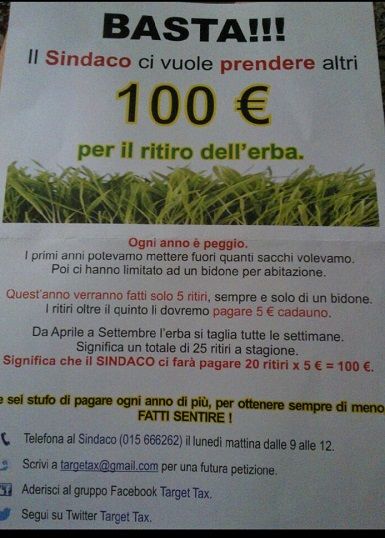 In particolare il primo cittadino viene messo sotto accusa per aver deciso di far pagare, dopo i primi cinque ritiri, per la raccolta degli sfalci verdi, che secondo i contestatori verrebbe a costare fino a cento euro l’anno, Per protestare i promotori di Target Tax chiedono di telefonare direttamente a Filoni. “Cosa che però chi sta dietro a questa iniziativa non ha fatto – commenta pacato il sindaco –, altrimenti avrei potuto spiegargli che far pagare per il ritiro del verde, come fanno tanti altri comuni a partire da Biella, è un atto di equità nei confronti di chi il verde non ce l’ha e prima invece lo pagava dentro la tariffa rifiuti. Certo, c’è un problema legato alla scelta della passata amministrazione di effettuare la raccolta con bidoni poco capienti, non appena il budget lo permetterà li sostituiremo con dei sacchi più adatti”.