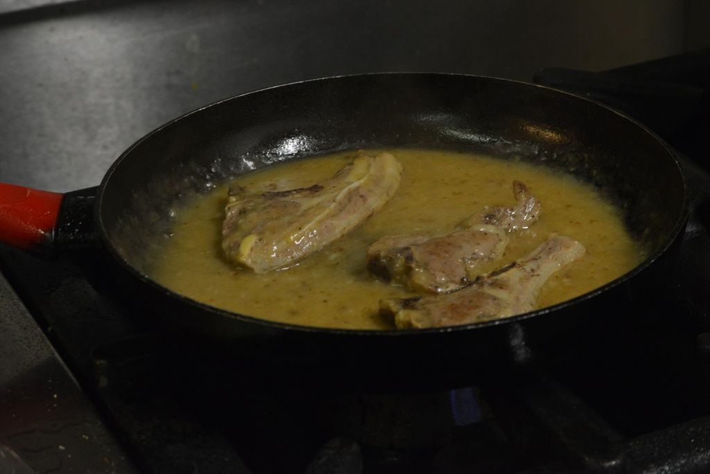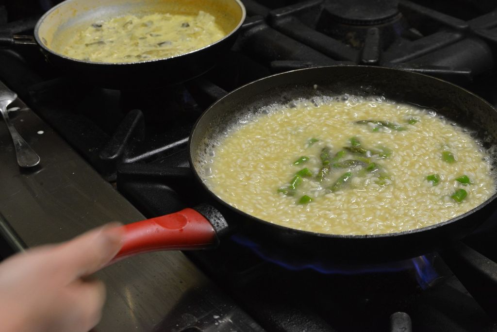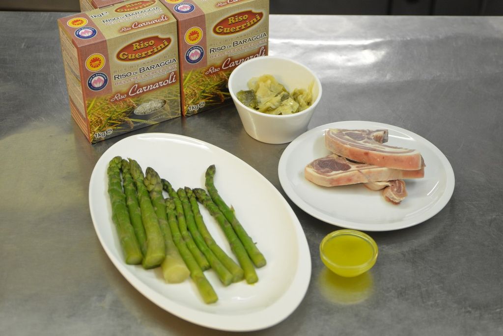 “Per prima cosa bollite gli asparagi, o cuoceteli al valore, - inizia lo chef - e fate saltare i porri in padella. Dopo potete passare alla preparazione del riso. In una pentola mettere una manciata di cipolla tritata, olio e burro. Quando il soffritto sarà dorato, aggiungete il riso, varietà Carnaroli della riseria Guerrini. Dopo averlo fatto tostare per qualche istante, sfumate con un bicchiere di vino bianco, possibilmente un Traminer Aromatico, e lasciate cuocere. Man mano che il riso si asciuga, aggiungere del brodo di manzo e andate avanti così fino a cottura. Ci vorranno circa 15 minuti. A parte, iniziate a preparare le costolette d’agnello e i porri. Le prime vanno rosolate in padella, come i secondi a cui va aggiunta la panna. Quando la carne è cotta, toglierla dalla pentola, dove potrete tirare la salsa, aggiungendo acqua e farina. Quando il riso è quasi pronto, mettere metà degli asparagi e tenere l’altra per la guarnizione. Per l’impiattamento, mettere al centro del piatto il riso, attorno gli asparagi, una spolverata di tartufo bianco o qualche goccia d’olio, sempre al tartufo, e appoggiare sopra la braciola d’agnello, con il suo sugo.”
