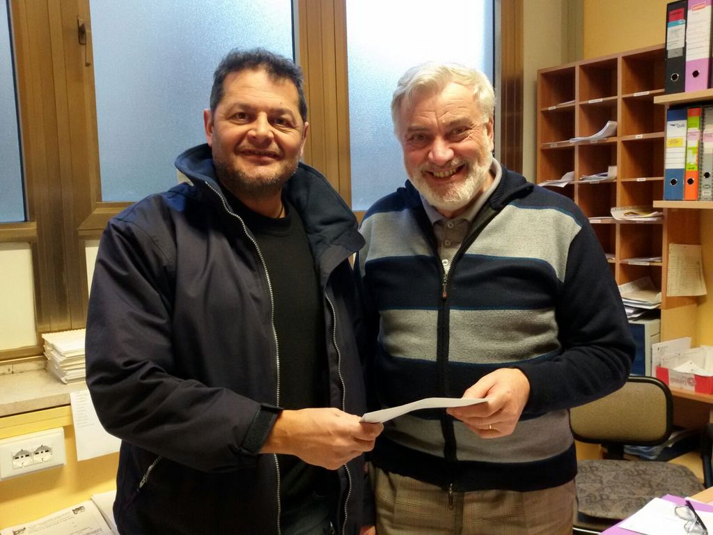 E' stato consegnato da Carlo Pedrazzo, presidente dell'Associazione Teatro Popolare di Sordevolo, a Daniele Maffeo, Presidente dell'associazione genitori sindrome autismo, il contributo ricavato dalla vendita delle tazze del mercatino.