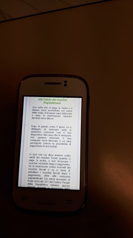 Gli agenti hanno così scoperto che lo schermo dello smartphone conteneva un messaggio apparentemente proveniente da un servizio di polizia, dove si diceva che l’apparecchio era stato bloccato per ragioni di sicurezza. La schermata proseguiva minacciando sanzioni penali, che si sarebbero potute evitare pagando una multa di 100 euro entro 48 ore. Ovviamente, il messaggio indicava anche le modalità di pagamento.