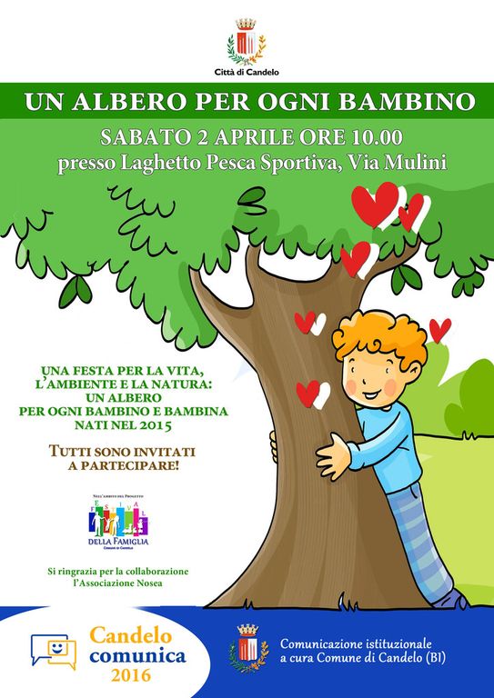Tutti i bimbi nati nel 2015 sono stati invitati sabato 2 aprile alle 10 presso l'area verde del laghetto della pesca in via Mulini per un momento in simbiosi con la natura. Seguirà il racconto di brevi fiabe da parte delle "nonne" della biblioteca civica Livio Pozzo