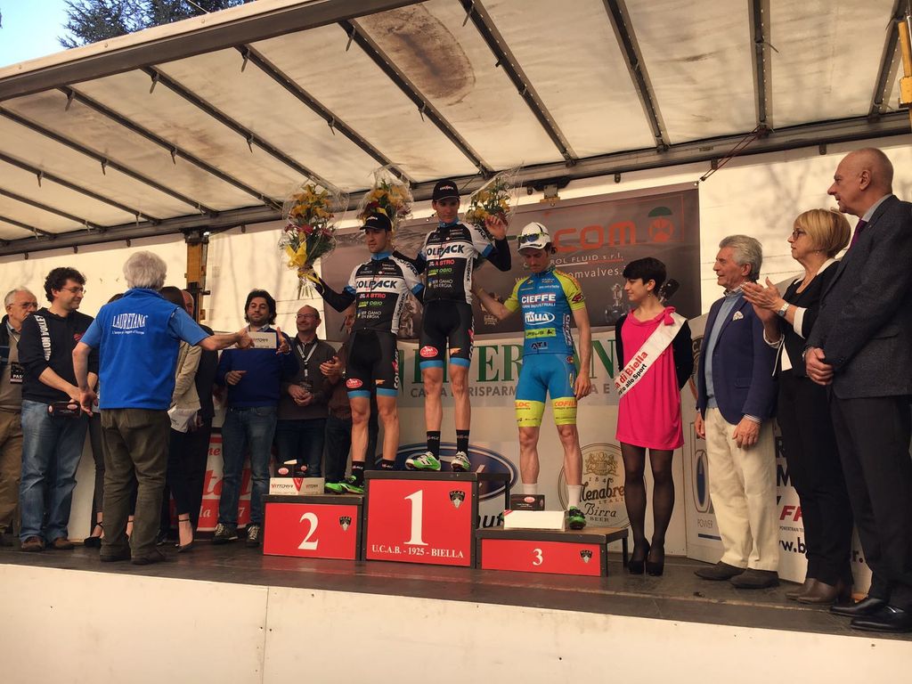 Il percorso si snodava su 148 km composti da un giro lungo attraverso il biellese e sei giri ad anello da 10,700 km in città. A 25 km dall'arrivo, guidano il gruppo Andrea Montagnoli (Hopplà Petroli Firenze) e Jacopo Mosca (GSC Viris Maserati). Subito dietro altri due ragazzi, Nicola Rossi e Raffaele Radice. Alle loro spalle il gruppo compatto. A 20 km Rossi e Radice vengono ripresi dal gruppo, mentre i due battistrada resistono e conducono con un vantaggio di 31''.