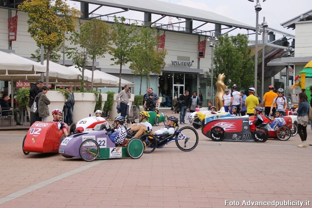 I cavalli non sono nei motori delle loro auto, perchè motori non ne hanno, ma nei muscoli delle loro gambe: sono i piloti della Formula 1 a pedali che si è svolta oggi, 30 aprile, nell'area esterna del Centro Commerciale Gli Orsi.