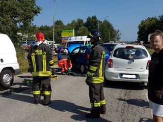 È di due feriti il bilancio dell'incidente che poco fa, intorno alle 11 di oggi, 27 agosto, ha coinvolto tre auto, un furgone e una moto nella strada che da Cossato va a Gattinara, all'altezza del Calzificio Biellese. Tutto è partito da un tamponamento tra le tre macchine: l'ultima vettura ha causato uno spostamento violento di una delle auto la quale, finendo sulla corsia opposta, ha colpito una moto in transito il cui conducente è stato successivamente travolto da un furgone.