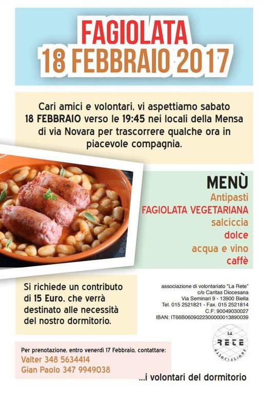 Il 18 febbraio alle 19.45, nei locali della Mensa di via Novara a Biella, i volontari dell'Associazione La Rete serviranno una gustosa fagiolata il cui ricavato verrà destinato alle necessità del dormitorio.