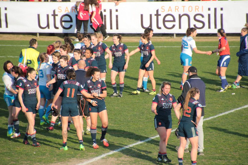 Fischio d’inizio e la partita entra già nel vivo: la linea di meta italiana viene immediatamente aggredita e non passano nemmeno dieci minuti che arriva la prima meta francese, segnata da Caroline Ladagnous, 0-5. Le italiane provano a contrattaccare, ma senza successo, le azioni offensive vengono bloccate dalla ben organizzata difesa francese. La Francia, con un calcio di punizione realizzato da Audrey Abadie e una meta segnata da Romane Maneger, vola a 0-13. L’Italia continua a subire senza segnare punti, non riuscendo a bloccare le azioni offensive avversarie mentre le Blue continuano a guadagnare altri sette punti dalla meta con trasformazione di Caroline Ladagnous.