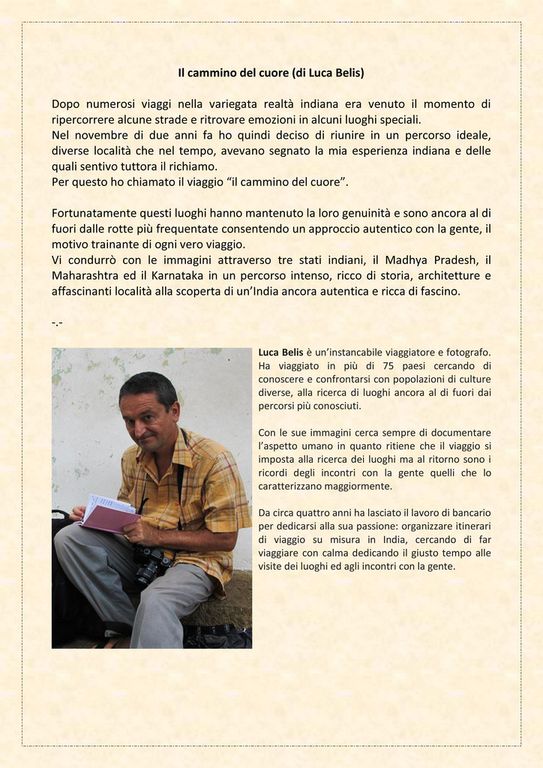 "Il cammino del cuore passa da Cossato, ospite degli amici di Foto.Art. Proporrò le immagini dei luoghi dell'India Centrale che più mi hanno affascinato nel corso di diversi viaggi collegate in un unico viaggio ideale. Il fascino di questi luoghi ancora poco visitati dai turisti, sta nel genuino rapporto umano in ambienti storici e naturali di grande suggestione. "