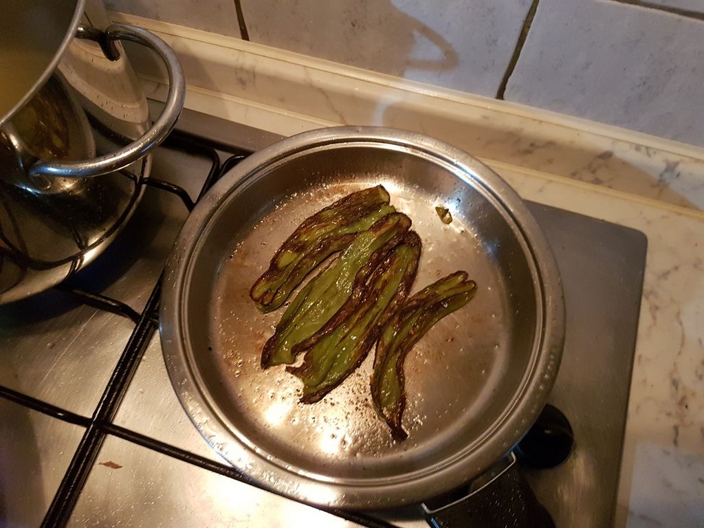 Pulite i friggitelli tagliandoli a metà per lungo, rimuovendo i semini.