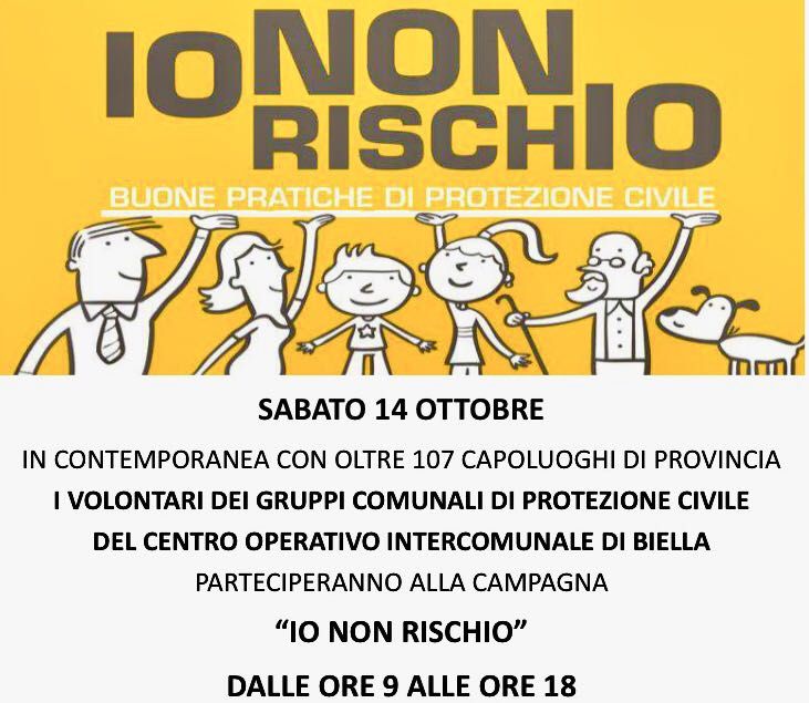 Sabato 14 ottobre, in contemporanea nazionale, anche Biella partecipa alla campagna "Io non rischio". Per scoprire cosa ciascuno di noi può fare per ridurre il rischio alluvione, l'appuntamento è al Centro Commerciale "Gli Orsi", dalle 9 alle 18. L'assessore Stefano La Malfa ha sottolineato che "i cittadini devono essere coinvolti ed affiancare la Protezione Civile, per ridurre i rischi e per avvisare le autorità di eventuali criticità. I primi soccorritori di se stessi e degli altri sono proprio i cittadini, nell'attesa dell'arrivo dei professionisti della sicurezza. La storia ci ha insegnato che durante l'alluvione del '68 molte persone avrebbero potuto salvarsi e salvare gli altri seguendo semplici istruzioni, proprio quelle che con queste iniziative vogliamo divulgare".