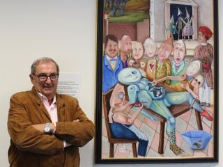 “Autopsia di un automa”, è questo il titolo del dipinto che adesso è affisso nella sala riunioni della direzione medica di presidio e che l’autore ha così illustrato: “L'uomo ha sempre nutrito la smisurata ambizione di imitare l'atto divino della creazione e per secoli si è dedicato alla costruzione degli automi, macchine antropomorfe che riproducessero almeno qualche caratteristica umana. Lo stupore suscitato da queste 'creature del second'ordine' si è via via mescolato con la riflessione sulle possibilità tecniche concrete, e all'elemento ludico e meraviglioso si sono sostituite le finalità pratiche. Questi raffinati e suggestivi prodotti dell'ingegno umano, che preludono in forme bizzarre e inusitate alla tecnologia moderna, oggi non si costruiscono più e sono rimpiazzati dovunque, se non nei musei e nei teatri della nostalgia, da dispositivi in cui l'elettronica si rivela sempre più sollecita dall'efficienza e sempre meno dell'imitazione puntuale della natura. Eppure gli automi continuano a popolare i sogni l'immaginario del nostro tempo e da qui travalicano nelle creazioni artistiche e nelle attuazioni tecniche. L'automa, protagonista, con occhio critico osserva le ragioni meccaniche della sua fine. In lontananza i teatranti danzano incuriositi”.