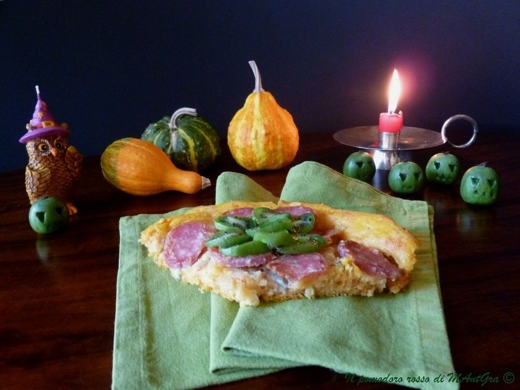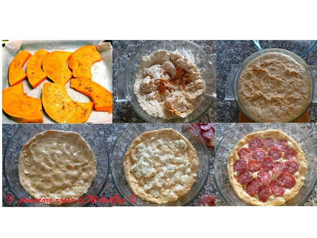 Una volta cotte, eliminate la scorza e schiacciate con una forchetta (no frullatore). In una ciotola, miscelate le farine con il lievito, unite la zucca e lentamente l’acqua, impastando fino ad ottenere un composto morbido (se troppo duro, aggiungete ancora un pochino di acqua tiepida; se troppo morbido, della farina. La consistenza dell’impasto dipende molto dall’acqua contenuta nella zucca). Allargate l’impasto e aggiungete 2 cucchiai d’olio e il sale, poi impastate bene. Lasciate lievitare lontano da correnti d’aria fino al raddoppio del volume, poi ungete bene una teglia da forno e depositatevi l’impasto, allargandolo partendo dal centro verso l’esterno della teglia, premendo bene con i polpastrelli e irrorando con un po’ d’olio. Distribuite sopra il Gorgonzola e, sopra ad esso, le fette di salame. Coprite e fate lievitare ancora per un’ora. Infornate (forno già caldo a 200°C) e lasciate cuocere per 20/25 minuti. Nel frattempo, lavate i Nergi e tagliateli a fettine. Sfornate la pizza, distribuite sopra le fettine di Nergi e servite.