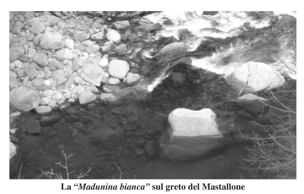 Gli anziani del luogo chiamano “Madunina bianca” la grande pietra chiarissima, lunga quasi due metri e con una forma particolare che richiama un sedile ed é posta dove il torrente esce da un orrido profondo, spumeggiante e dove s’ode un rombo sordo provocato dall’ urto delle acque sulle rocce.
