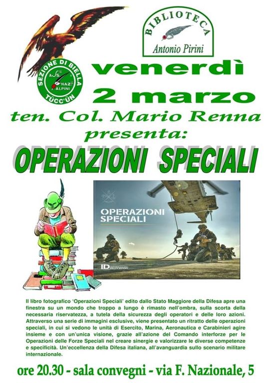Venerdì 2 marzo, alle 20.30, nella sala convegni della sezione ANA di Biella/Biblioteca “Antonio Pirini”, il ten. col. alpino Mario Renna presenterà il libro fotografico “Operazioni speciali”, edito dallo Stato Maggiore della Difesa.