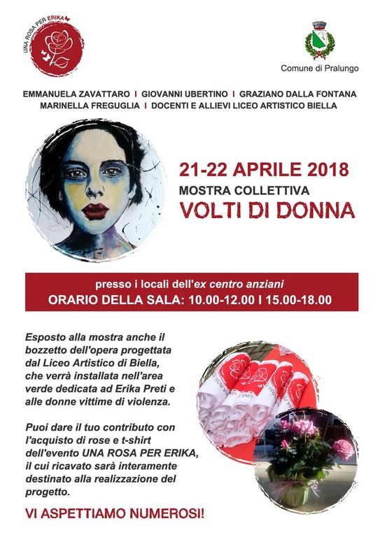 Lo scorso weekend Pralungo e buona parte del Biellese hanno preso parte alla due giorni di “Una rosa per Erika”, manifestazione promossa da alcuni amici della sfortunata ragazza e coordinata dal Comune di Pralungo. Un segno tangibile di vicinanza ai familiari di Erika, volto soprattutto a sensibilizzare sul problema della violenza di genere. Tra i tanti eventi in programma, anche l’inaugurazione della mostra “Volti di Donna”, realizzata da vari artisti come Emanuela Zavattaro, Marinella Freguglia, Graziano Dalla Fontana, Giovanni Ubertino e che resterà aperta anche nelle giornata di domani, sabato 21, e domenica 22 aprile, nei locali dell’ex centro anziani di Pralungo (dalle 10 alle 12 e dalle 15 alle 18).