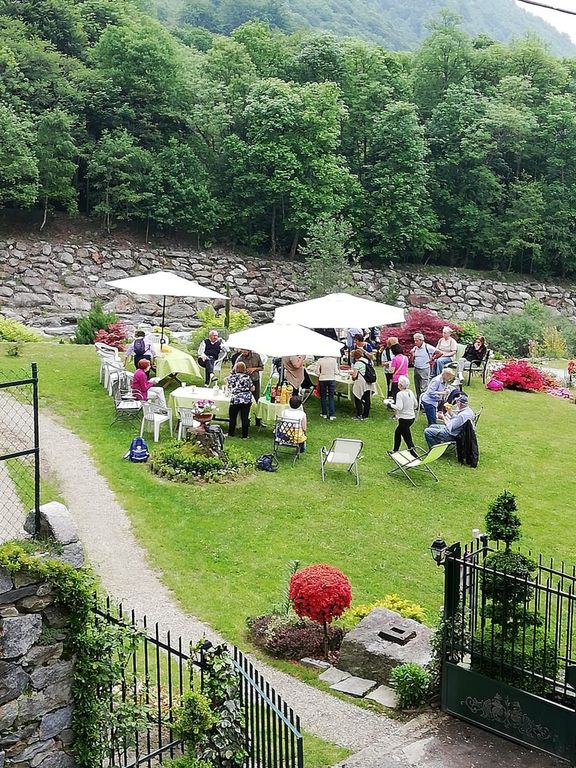 Durante la passeggiata i padroni di casa, con l'aiuto di volontari della Proloco di Piedicavallo, hanno trasformato una parte del giardino: splendide tavole elegantemente apparecchiate con squisitezze per la merenda, accompagnante da ristoratrici bevande e persino posto da sedere per tutti. Alla conclusione dell'incontro sono state lette due belle poesie di autori locali in tema floreale. Molti dei presenti, sorpresi dalla bellezza del luogo lo hanno paragonato ad una piccola Burcina , certamente la passione costanza e ospitalità di Sandro hanno già trasformato questo angolo pietroso in un'oasi felice, aspettiamoci altre meraviglie nei prossimi anni! Il gruppo è già pronto per scoprirle.