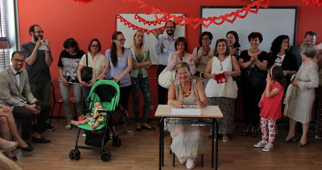 Lo staff, con tanto di logo sulle t-shirt, l'ha accompagnata nelle aule predisposte dai tre ordini di scuole per assistere ai cortometraggi con i quali allievi e docenti l' hanno salutata in modo originale. Sempre l'efficiente staff, composto dai genitori del consiglio di istituto, ha curato il rinfresco allestito con tavoli e gazebo nel prato della scuola. A concludere la serata il coro dell'istituto e quello “gemello” di Romans sur Isere seguiti da un simpatico medley dove docenti e collaboratori hanno messo la voce e la faccia. Tanto affetto, calore e simpatia per chi ha lasciato una traccia importante.