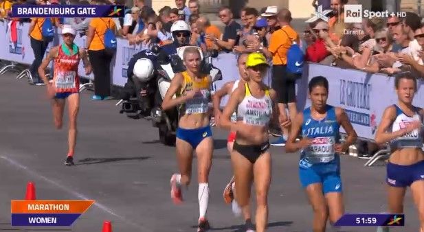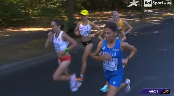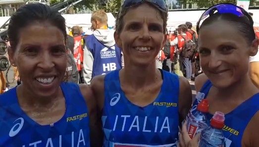Secondo posto di squadra con l'Italia, dietro alla Bielorussia, e 14mo posto finale per Fatna Maraoui nella maratona valevole per i campionati europei corsa stamane, 12 agosto, a Berlino. Alla sua ottava maratona in carriera la 41enne azzurra biellese dell'Esercito, dopo una buona prima parte di gara, si è staccata dal primo gruppo in lotta per le medaglie arrivando al traguardo dopo 42,195 km con il tempo di 2h34'48". Prima di lei Sara Dossena, sesta con primato personale di 2h27'53" e la valdostana Catherine Bertone, sposata con il biellese Gabriele Beltrami e allenata da Roberto Rastello, ottava in 2h30'06".