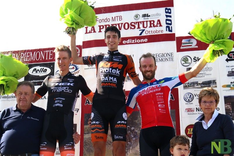 In testa per i primi chilometri sui 48 del percorso, che si snodava tra i vigneti delle colline biellesi, i due atleti del Ktm Protek Dama Denis Fumarola e Jhonnatan Botero Villegas. Dopo un po’ il primo riesce a prendere un margine di vantaggio su un tratto in salita e scollina solitario in cima al gruppo. Quasi alla fine viene raggiunto nel tratto in discesa e si gioca la vittoria con una volata da fotofinish, riuscendo a mettere la sua KTM Scarp Prestige davanti a tutti.