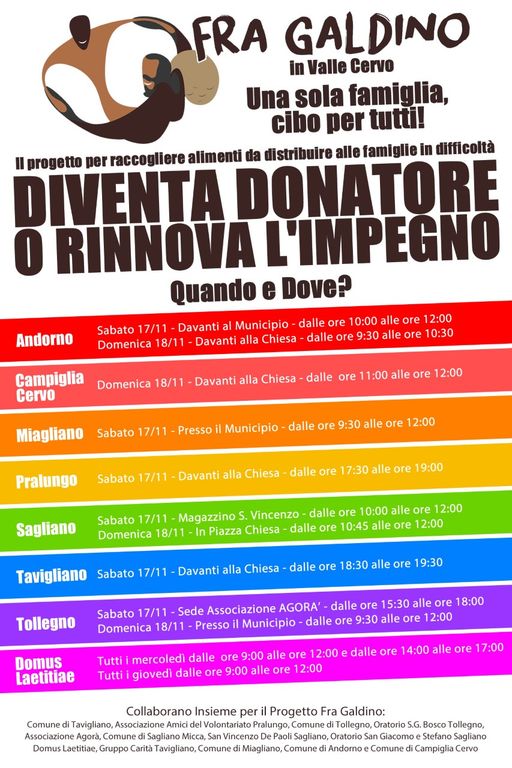 Nel weekend del 17 e 18 novembre prossimi, come si legge nel manifesto, sarà possibile rinnovare il tesseramento o diventare un nuovo sostenitore: in ogni comune e in ogni associazione i volontari saranno disponibili per raccontare cosa fanno e come vengono utilizzati gli aiuti delle famiglie. L’impegno richiesto è quello di donare, per un anno con cadenza almeno mensile, un alimento o un bene di prima necessità concordato con l’associazione che si occupa della raccolta. L’invito è aperto a tutti, senza distinzione di appartenenza o idea, perché la solidarietà deve superare i nostri pregiudizi.