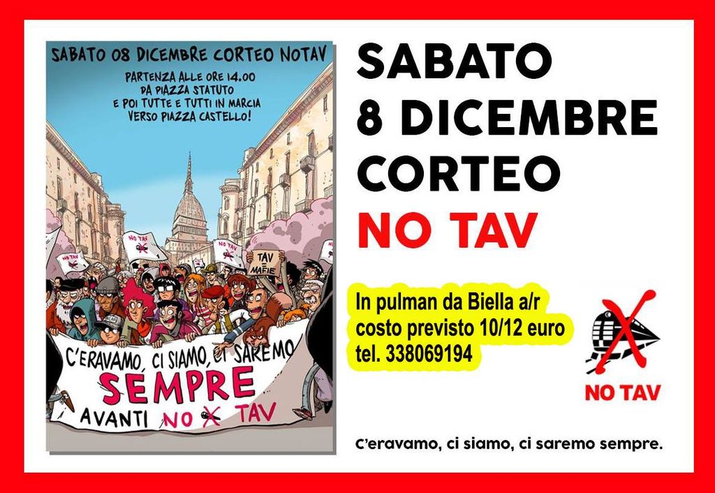 Il Gruppo Biellese NO TAV in collaborazione con Anpi Valle Elvo e Rifondazione Comunista di Biella sta organizzando un pullman per partecipare alla manifestazione NO TAV che si terrà a Torino l'otto dicembre prossimo. È stato chiesto un preventivo e il costo dovrebbe aggirarsi intorno ai 12 euro. Chi è interessato deve prenotare entro lunedì 3 dicembre telefonando al numero 3385069194.
