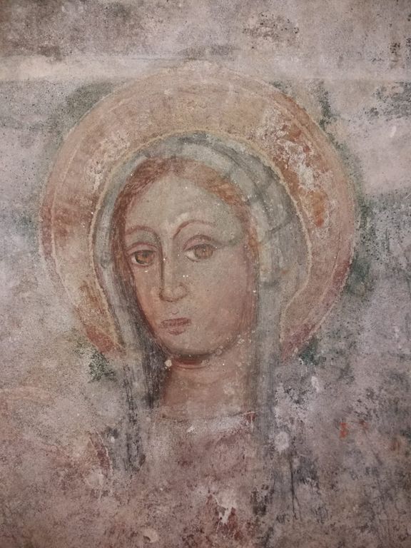 Il registro superiore purtroppo non è altrettanto ben conservato a causa dell'apertura di una finestra che ha danneggiato gli affreschie e che in seguito è stata tamponata. Sulla parete destra una mano diversa ha affrescato una Madonna con Bambino: Gesù stende la mano in fuori nell'atto di ricevere un dono, forse da un Re Mago oppure di porgere un anello a Santa Caterina o ancora di benedire qualche devoto. Anche su questa parete l'apertura successiva di una porta ha causato la distruzione di parte della scena. La differenza stilistica tra le due pareti è evidente e suggerisce di ipotizzare diverse fasi decorative. Nonostante alcune porzioni di affreschi siano andate perdute e lo scialbo che ancora le ricopre sia piuttosto tenace, l'alta qualità materica delle porzioni rinvenute, perfettamente ancorate alla muratura ed eseguite a buon fresco, incoraggiano a proseguire i lavori di restauro che renderanno perfettamente leggibile quanto conservato e consentiranno di ammirare i vivi colori che al momento si intravedono sotto il bianco di scialbo.