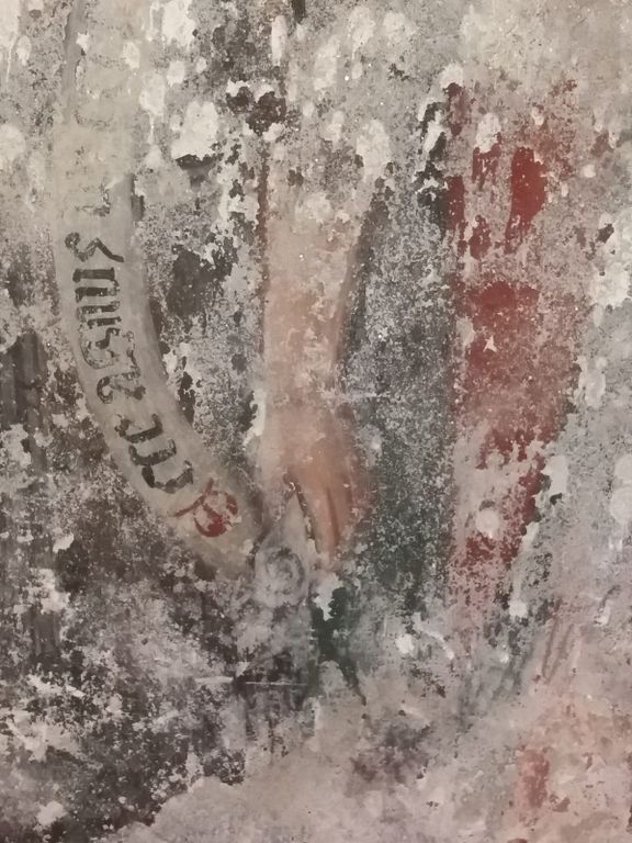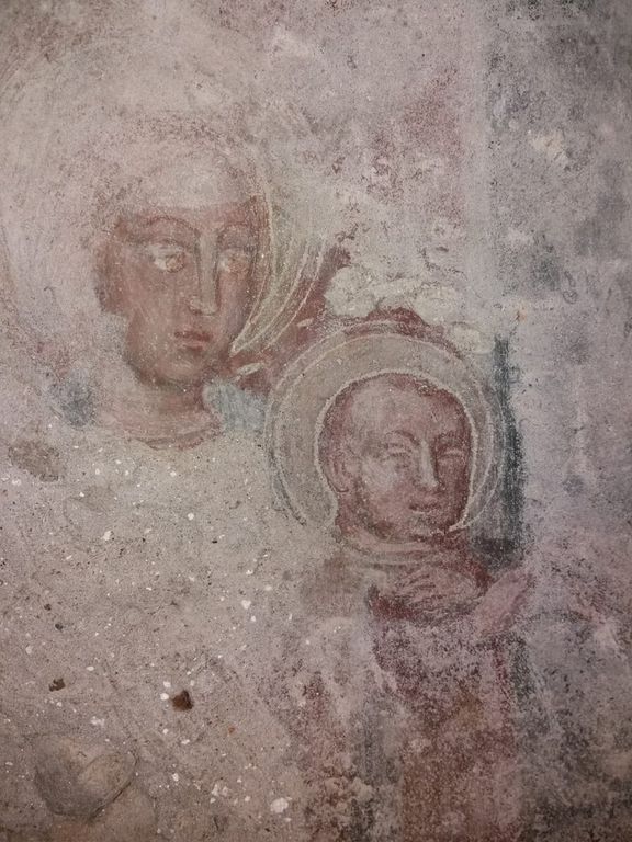 Durante questi delicati lavori di stonacatura è emerso un ciclo pittorico ascrivibile al XV secolo, realizzato a buon fresco e steso a giornate. Al momento, sotto lo scialbo che ancora li ricopre, si riescono a individuare sulla parete di sinistra due registri sovrapposti riquadrati con delle linee bianche e sfondi ad ampie campiture omogenee; nel registro inferiore si distinguono diverse figure sacre con l'aureola tra cui un santo, giovane, con il caratteristico saio grigio, la tonsura e il pastorale, una santa, ai cui piedi è inginocchiato un devoto, una Madonna con Bambino, un santo più anziano, con i capelli grigi e la barba e il frammento di un San Giovanni Battista, identificabile grazie al cartiglio che tiene in mano sul quale si legge "Ecce Agnus Dei".