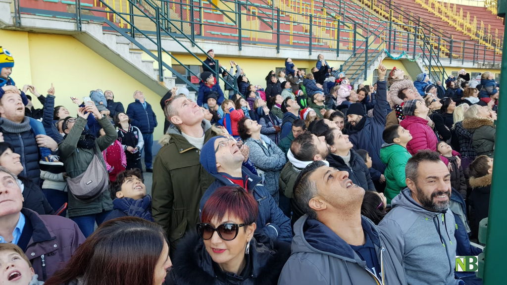 Migliaia di persone hanno assistito oggi pomeriggio, 24 dicembre, alla discesa dal cielo di Babbo Natale. Il simpatico vecchietto vestito di rosso si è lanciato, insieme ai suoi aiutanti, da un grande elicottero ed è atterrato in paracadute al centro dello stadio Pozzo La Marmora di Biella. Gremito per l’occasione di famiglie e bambini, col naso all’insù ad assistere alla prova mozzafiato. Grande entusiasmo dei presenti e consegna dei doni al termine della manifestazione.