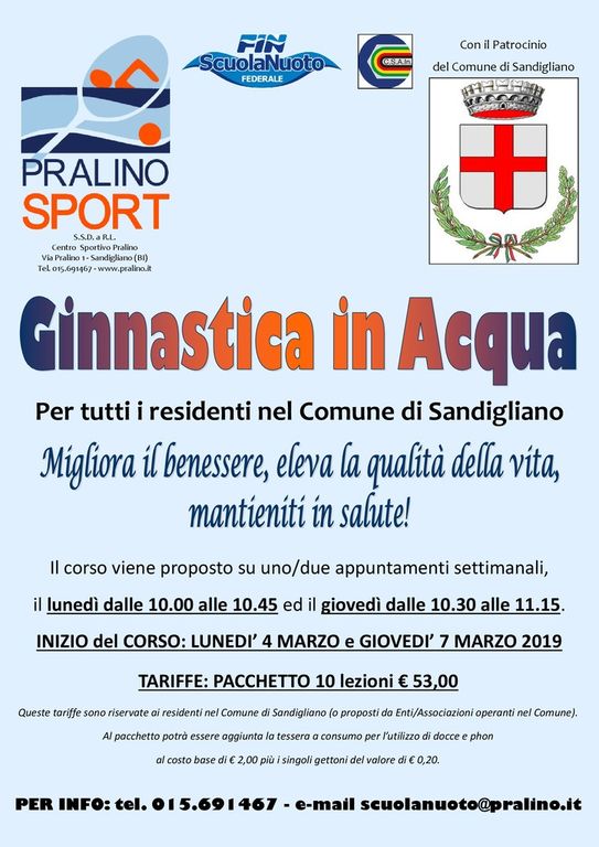 Il Comune di Sandigliano ha concesso patrocinio gratuito al progetto "Ginnastica in acqua", presentato dalla Società Pralino Sport S.S.D., che ha sede in paese, presso la Piscina Pralino.