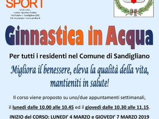 Con il monito "Migliora il benessere, eleva la qualità della vita, mantieniti in salute", nel mese di marzo inizierà il corso di Acqua Gym per tutti i residenti a Sandigliano, con due appuntamenti settimanali, il lunedì dalle 10 alle 10:45, ed il giovedì dalle 10:30 alle 11:15.