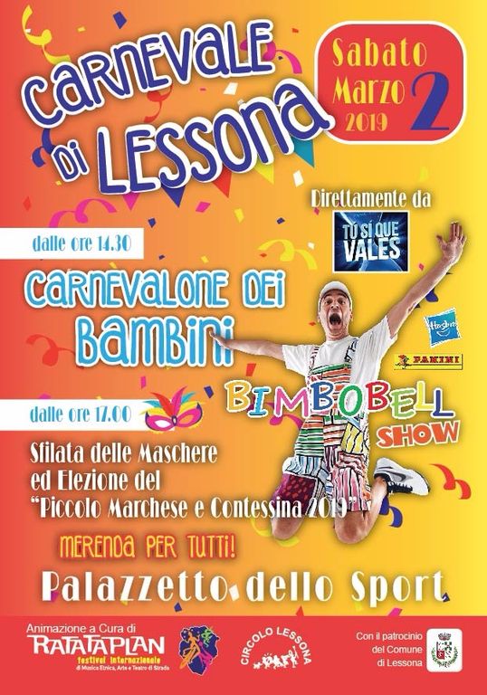 Il circolo Lessona, con il patrocinio del comune e la collaborazione di Ratataplan per l’animazione, ha programmato due giornate di intenso divertimento, in cui le maschere e la tradizione carnevalesca saranno protagoniste. La due giorni aprirà le danze sabato 2 marzo al Palazzetto dello sport, con un pomeriggio in costume a misura di bambini. Alle 14.30, direttamente da Tù Sì Que Vales, lo show di Bimbobell. Alle 17 i bambini sfileranno per mostrare le loro maschere e verranno eletti “Il piccolo Marchese e la Contessina” del Carnevale di Lessona 2019. Per chiudere con dolcezza il pomeriggio di festa verrà offerta la merenda a tutti i presenti.