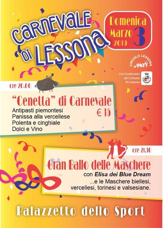 Anche domenica 3 marzo il ritrovo sarà al Palazzetto e, alle 20, verrà servita la “Cenetta di Carnevale”. Il menù: antipasti piemontesi, panissa alla vercellese, polenta e cinghiale, dolce e vino a soli 15 euro. Per chiudere la serata speciale e i festeggiamenti carnevaleschi, alle 21,30 i commensali saranno invitati a partecipare al Gran ballo delle Maschere. Sulle note e l’accompagnamento canoro di Elisa dei Blue Dream danzeranno le maschere del territorio piemontese: i costumi tipici biellesi, vercellesi, torinesi e valsesiani. Così si abbasserà il sipario sull’atteso Carnevale 2019 a Lessona.