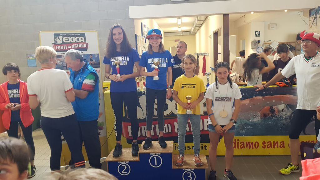 Negli Esordienti Maschi buona la prova di Giacomo Frassati che chiude all’8° posto a soli 30” dal podio, peccato per una grave indecisione nella prima transizione che gli ha compromesso un risultato migliore. Nelle Ragazze Femminile si è assistito come al solito ad un duello tutto bianco azzurro, dall’acqua sono uscite ben quattro IronGirls una dietro l’altra, prima Costanza Antoniotti a circa 9 secondi Marta Angelino, seguita da Arianna Chiorboli e Carlotta Freguglia, dietro il trenino IronBiella tutte le atlete delle altre squadre. Nel ciclismo Costanza Antoniotti seguita a circa 200 m di distanza da Marta Angelino hanno fatto praticamente gara a se incrementando gradualmente il loro vantaggio, seguite da una tenacissima Arianna Chiorboli. Nella run finale Costanza con un ritmo impressionante ha incrementato ulteriormente il vantaggio acquisito nelle due precedenti frazioni, chiudendo con un meritatissimo oro, con l’ottimo tempo di 15’ e 8”, seguita sul podio dalla compagna di squadra Marta che ha chiuso in 15’ e 47”. Quinto posto per Arianna Chiorboli , ed un ottimo 8° posto per Carlotta Freguglia , sempre più a suo agio nelle dure fatiche della triplice. Anche nella categoria Ragazzi Maschile Pietro Gardini ha raggiunto l’argento grazie ad una gara condotta, soprattutto nella bike, con un estremo acume tattico. Il giovane atleta si è risparmiato nella seconda frazione per poi affondare la sua stoccata finale nell’ultimo giro della run che gli ha consentito di salire sul 2° gradino del podio per un meritatissimo argento.