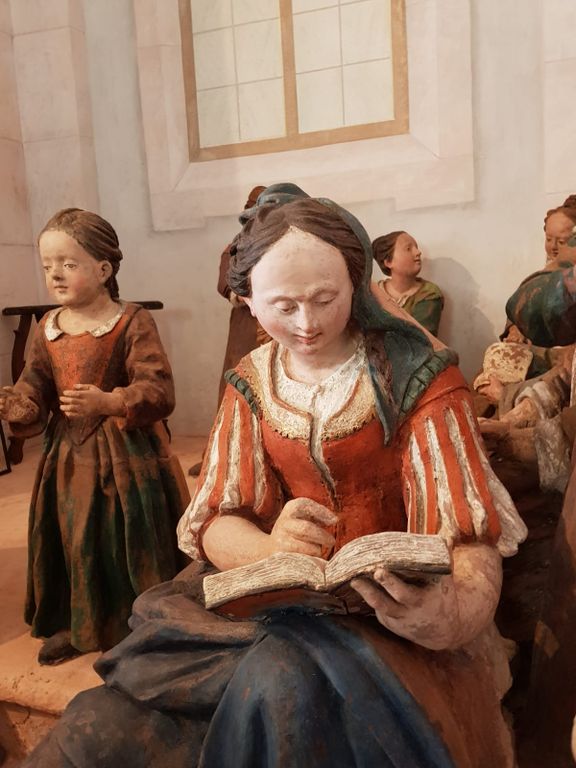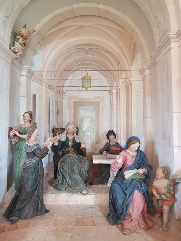 A renderlo sostenibile è stata la Compagnia di San Paolo di Torino con Fondazione Cariplo, Fondazione Cassa di Risparmio di Biella, Banca Simetica di Biella. A condurlo, con la direzione ed il controllo della Soprintendenza di territorio e della direzione dell’Ente Sacri Monti, è stata l’equipe del restauratore Claudio Valazza. Nella cappella è felicemente rappresentata, in una scena domestica e intima, la Madonna quando viveva nel tempio. Ad accompagnarla è un variopinto gruppo di donne, alcune con i loro bambini, intente a varie attività, lettura, musica e canto e soprattutto alla filatura e tessitura. Un racconto di quotidianità, come si vede nel bel dettaglio della lite tra le due fanciulle nell’abside di destra. Maria, seduta al tavolo da lavoro, nell’abside di fronte all’ingresso, è facilmente individuabile perché circondata da graziosi angioletti.