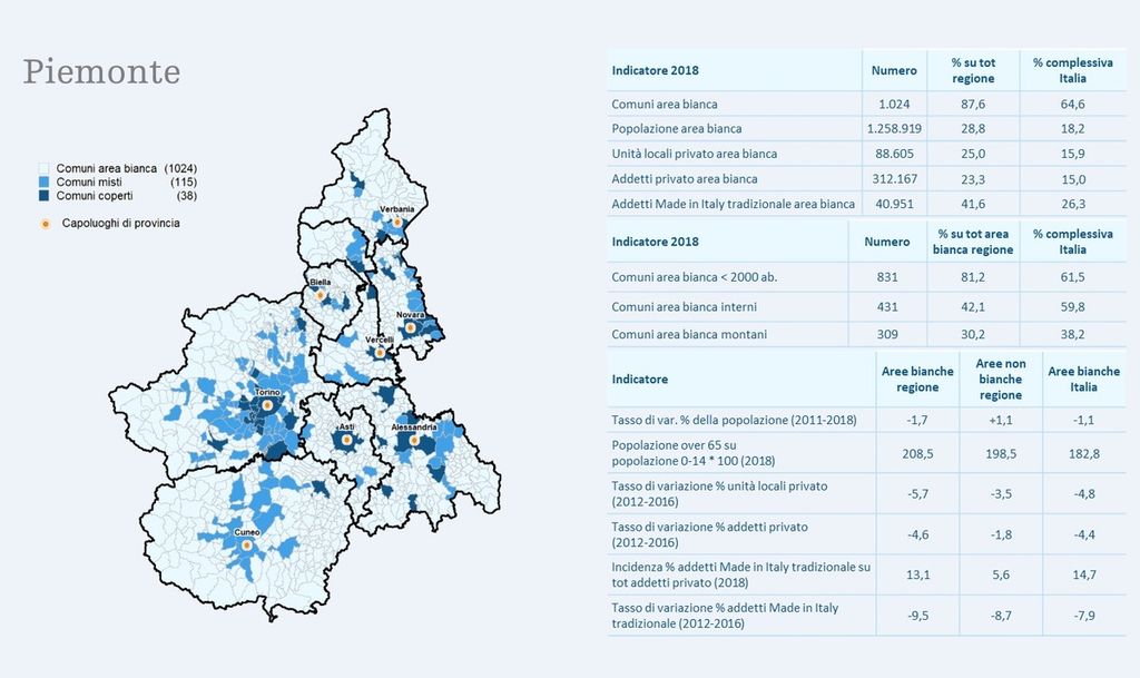 I Comuni delle "aree bianche" del Piemonte, compresi totalmente o parzialmente negli interventi che Open Fiber sta facendo per dotare tutte le abitazioni di banda ultralarga, sono 1.024 per oltre 1,2 milioni di abitanti. Il 28% delle strutture turistico-alberghiere e il 25% dei posti letto è situata in questi territori. La ricerca Eolo-Università di Padova ha analizzato anche le cause economico sociali dello spopolamento che caratterizza i piccoli comuni e l'impatto di questo fenomeno sull'economia del Paese. Viene evidenziata l'emergenza silenziosa che coinvolge il 42,3% degli italiani, pronto a lasciare il proprio paese alla ricerca di maggiori opportunità economiche e lavorative (83%), servizi di livello europeo per il tempo libero e i consumi (79%) e migliore connettività e accessibilità a internet, importante per il 64,4% degli intervistati (16,3 milioni di adulti). Anche il Piemonte è colpito dal fenomeno dello spopolamento: se nei comuni coperti la popolazione registra un +1,1%, nelle aree bianche il segno è opposto, con un -1,7%.