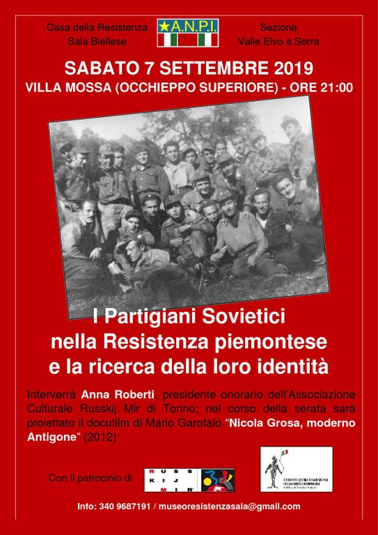 "I partigiani sovietici in Piemonte e la ricerca della loro identità", conferenza in programma sabato 7 settembre, a partire dalle 21, presso la Sala delle Carrozze di Villa Mossa a Occhieppo Superiore, è promossa dalla Casa della Resistenza di Sala Biellese e dalla sezione A.N.P.I. Valle Elvo e Serra nell'ambito delle iniziative commemorative dell 75° anniversario del rastrellamento in Valle Elvo e Serra e dell'eccidio di piazza Q. Sella (28 maggio - 4 giugno 1944), con il patrocinio dell'Istituto per la storia della Resistenza e della società contemporanea nel Biellese, nel Vercellese e in Valsesia, e dell'Associazione culturale Russkij Mir di Torino.