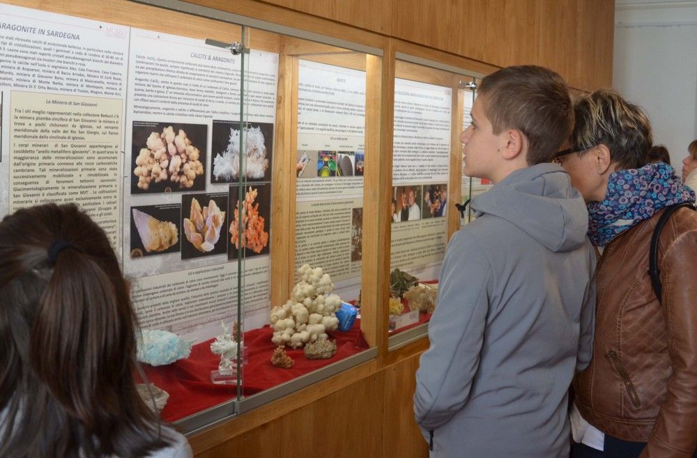 Non deve stupire il fatto che la maggioranza dei campioni della collezione Beducci-Bertolone provenga dai giacimenti minerari dell’Iglesiente: quest’area della Sardegna, oltre a vantare i terreni di formazione più antica rispetto a tutto il resto d'Italia, concentra anche l'area più estesa per varietà e numero delle attività minerarie svolte negli ultimi secoli in Sardegna. Tra i siti meglio rappresentati nella collezione Beducci-Bertolone c’è la miniera piombo-zincifera di San Giovanni, gicimento che riveste un notevole interesse mineralogico, a pochi chilometri da Iglesias, sul versante meridionale della valle del Rio San Giorgio. Questa miniera, grazie alla presenza della grotta di Santa Barbara, costituisce uno dei gioielli del Parco Geominerario, Storico e Ambientale della Sardegna. Per l’allestimento biellese 2019 sono stati scelti ed esposti per la prima volta diversi minerali provenienti da questa miniera, tra cui alcuni esemplari di carbonati come calcite e aragonite.