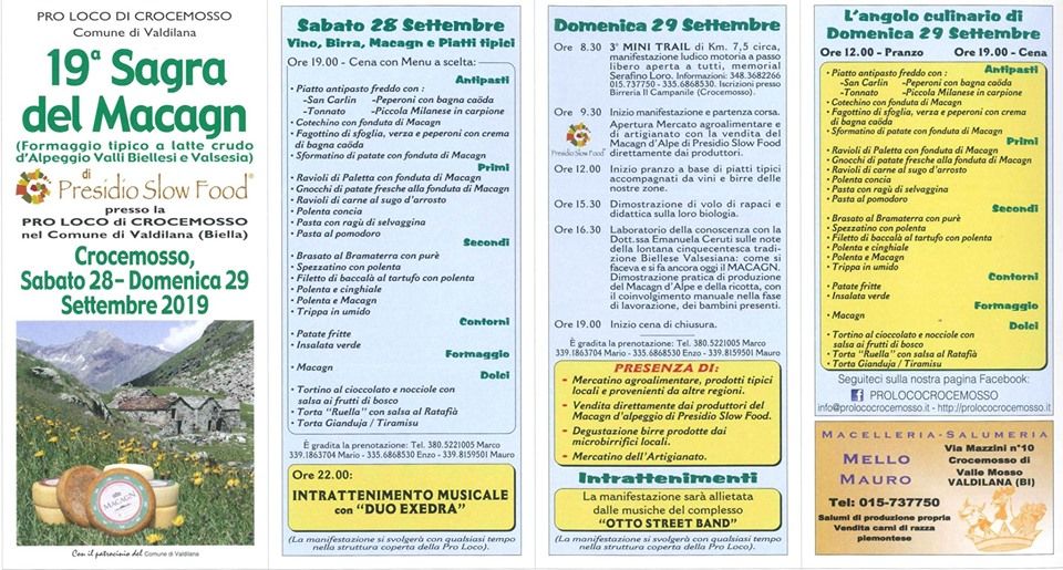La Sagra del Macagn sta per tornare. Quest’anno la festa per il formaggio a latte crudo d’alpeggio biellese e valsesiano di Presidio Slow Food, arrivata alla 19a edizione, si svolgerà sabato 28 e domenica 29 settembre nella sede della pro loco di Crocemosso, nel comune di Valdilana.
