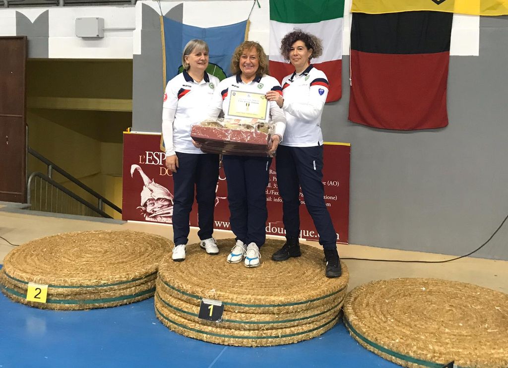 Le moschettiere degli Arcieri Biella Revera, Baietto e Accotto a Chatillon riconquistano per la terza volta consecutiva il primo gradino del podio. Neppure la compagine d'oltralpe hanno potuto nulla contro di loro fermandosi a 155 punti di distanza. Sara Pivaro è rimasta di riserva garantendo in ogni caso il successo. Negli individuali si sperava qualche cosa in più ma il miglior piazzamento è risultato solo il quarto di Revera.