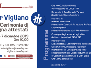 Sabato 7 Dicembre, a Vigliano via Libertà, alle 10, si svolgerà la cerimonia di consegna degli attestati di qualifica e specializzazione agli allievi frequentati i percorsi formativi, erogati dal CNOS FAP di Vigliano Biellese nel corso dell'Anno formativo 2018-2019.