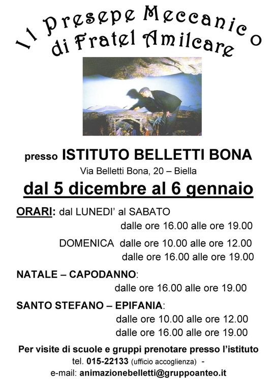 Da giovedì 5 dicembre a lunedì 6 gennaio 2020, sarà aperto lo storico Presepe di Fratel Amilcare, che dal dicembre del 2001 è allestito in modo permanente nella casa di riposo Istituto Belletti Bona a Biella. Per solennizzare l'evento, il 5 dicembre alle 16,30, il coro dei bambini della scuola primaria dell'Istituto La Marmora dei Fratelli delle Scuole Cristiane, allieterà tutti i presenti con canti natalizi.