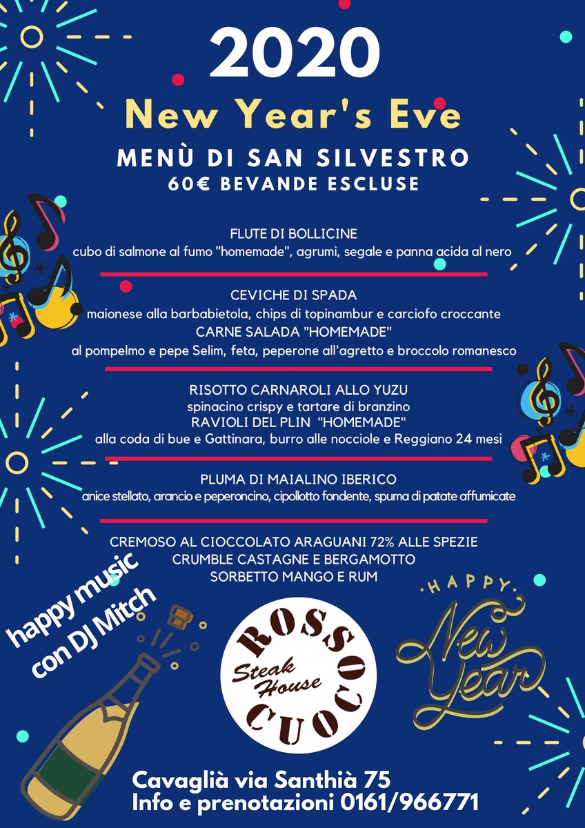 Anche il Cenone di Capodanno è predisposto. Rossocuoco accenderà i fornelli per festeggiare assieme l'ultimo giorno del 2019 e salutare il 2020. Questa volta la scelta è semplice e perfetta: un menù di San Silvestro pensato per stregare i presenti e prepararli a ballare a ritmo di Dj Mitch in attesa del brindisi di mezzanotte. Un aperitivo da sorseggiare ammirando le buche del campo da Golf per poi passare alle portate: 2 antipasti, 2 primi, 1 secondo e dolci. Costo 60 euro bevande escluse.