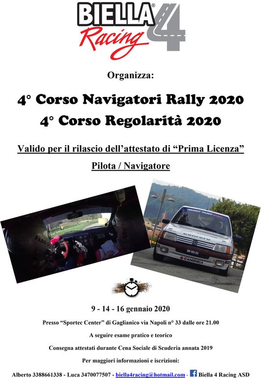 Passando alla 4^ edizione del Corso Navigatori/Regolarità possiamo dire che: “possiamo dire che, come sempre, il nostro Corso è valido per l’ottenimento dell’attestato necessario per il rilascio della cosiddetta “Prima Licenza Rallystica”, senza il quale non si potrebbe ottenere. Che è aperto sia a chi vuole pilotare e sia a chi vuole dettare le note, in quanto il corso base è identico, così come la licenza a cui si può accedere. Che si svolgerà sulle consuete tre serate teoriche nelle giornate del 9 - 14 - 16 gennaio 2020, e che verrà seguito dalle immancabili prove teoriche e pratiche in date da concordare in base alle disponibilità di tutti. Le lezioni si terranno presso lo “Sportec Center” di Gaglianico, via Napoli n°33, con orario indicativo dalle 21.00 alle 23.00, ed il materiale necessario sarà interamente fornito da noi.