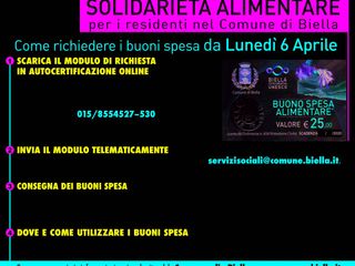 A partire da lunedì, 6 aprile, sarà possibile richiedere il “bonus spesa” solidarietà alimentare riservato ai residenti nel Comune di Biella. Il sussidio, recante il valore nominale di 25 euro, sarà erogato con voucher non replicabile. A titolo esplicativo: un nucleo composto da una o due persone disporrà di 50 euro a settimana, nucleo di tre persone 75 euro, nucleo di quattro persone 100 euro. Nel seguente avviso sono riportati i criteri per l’ammissione, il valore del buono, le modalità di erogazione e le tempistiche. L’elenco degli esercizi commerciali dove poter utilizzare i buoni spesa sarà disponibile sul sito Internet del Comune di Biella, in costante aggiornamento, da lunedì 6 aprile.